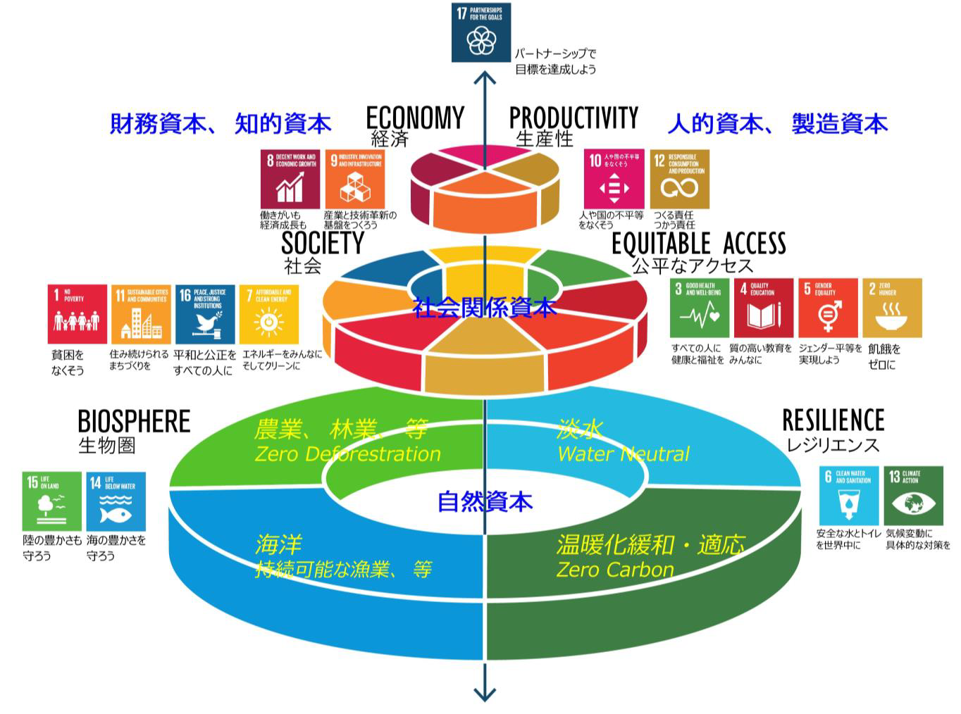 | 地球の環境を保護しながら、あらゆる貧困を解消し、全ての人が社会の一員として、平和と豊かさを得ることができる社会 | 地域の住民や団体等が連携して、「住民一人ひとりの暮らしと生きがい」や「地域」を共に創っていく社会 |